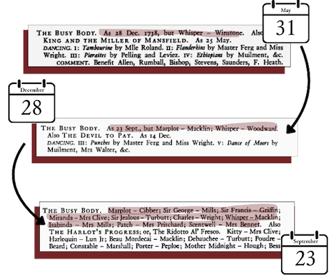Making the appropriate substitutions, the reader can infer that the cast list advertised for the December performance was "Marplot-Macklin; Sir George-Mills; Sir Francis-Griffin; Miranda-Mrs Clive; Sir Jealous-Turbutt; Charles-Wright; Whisper-Woodward; Isabinda-Mrs Mills; Patch-Mrs Pritchard; Scentwell-Mrs Bennet," and that for the May performance it was "Marplot-Macklin; Sir George - Mills; Sir Francis - Griffin; Miranda - Mrs Clive; Sir Jealous - Turbutt; Charles - Wright; Whisper-Winstone; Isabinda - Mrs Mills; Patch - Mrs Pritchard; Scentwell - Mrs Bennet." Tracing these ladder cast lists without the aid of a database can be painstaking work if several substitutions are made over a series of performances.